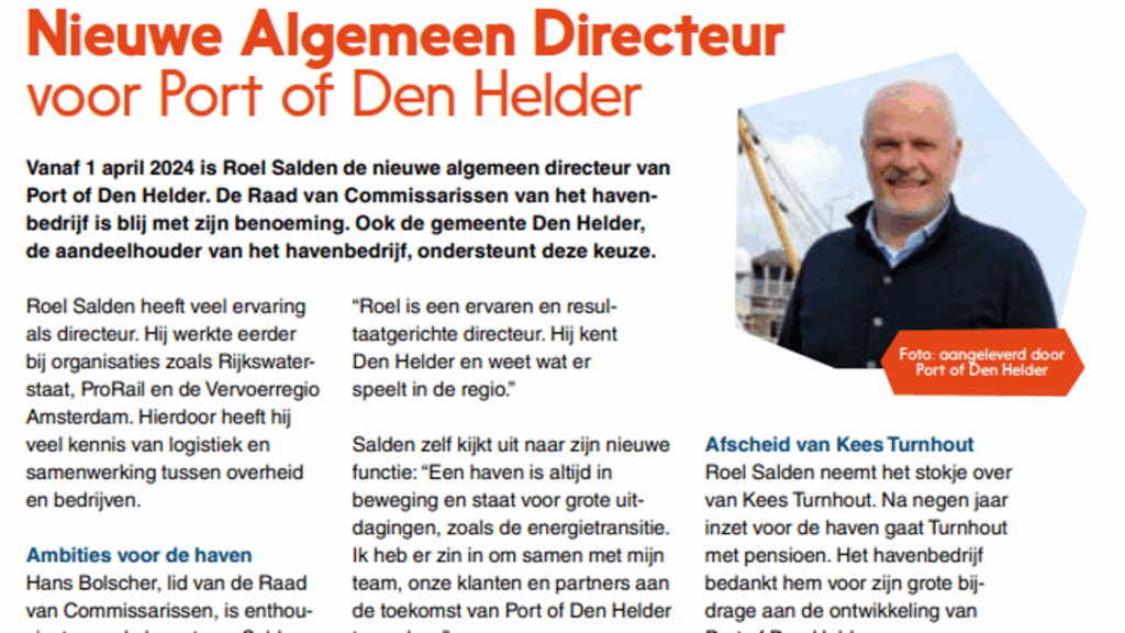 Vanaf 1 april 2024 is Roel Salden de nieuwe algemeen directeur van Port of Den Helder. De Raad van Commissarissen van het havenbedrijf is blij met zijn benoeming. Ook de gemeente Den Helder, de aandeelhouder van het havenbedrijf, ondersteunt deze keuze.