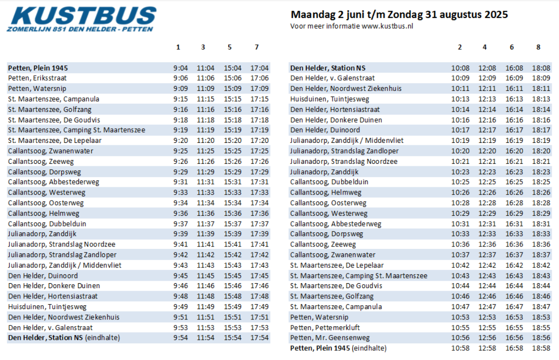 De Kustbus brengt je overal, gratis, duurzaam en elke dag. Bekijk de actuele dienstregeling op www.kustbus.nl.