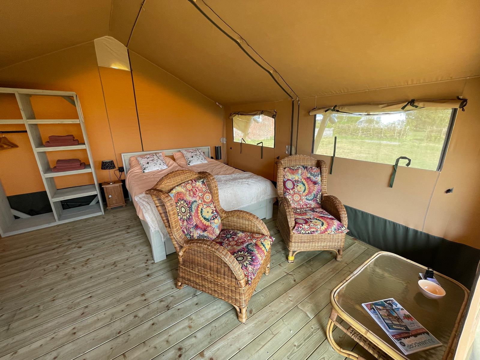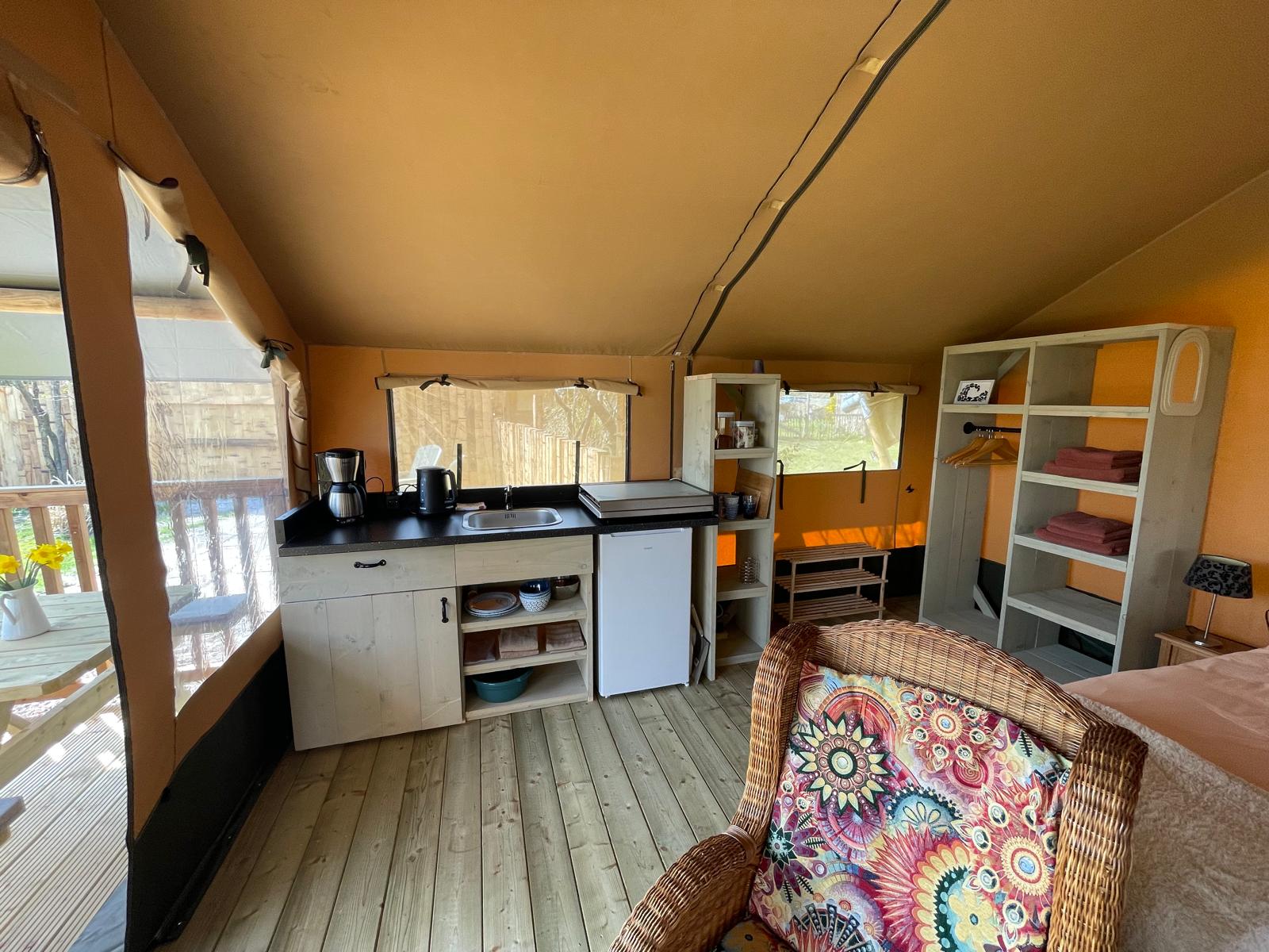 Das Safarizelt verfügt über ein Doppelbett, eine Sitzecke und eine voll ausgestattete Küche. Sie finden dort Kaffee- und Teezubereitungsmöglichkeiten, einen Kühlschrank, einen Gasherd und einen Backofen. Draußen können Sie auf Ihrer privaten Terrasse in der Sonne oder unter dem Sternenhimmel entspannen.